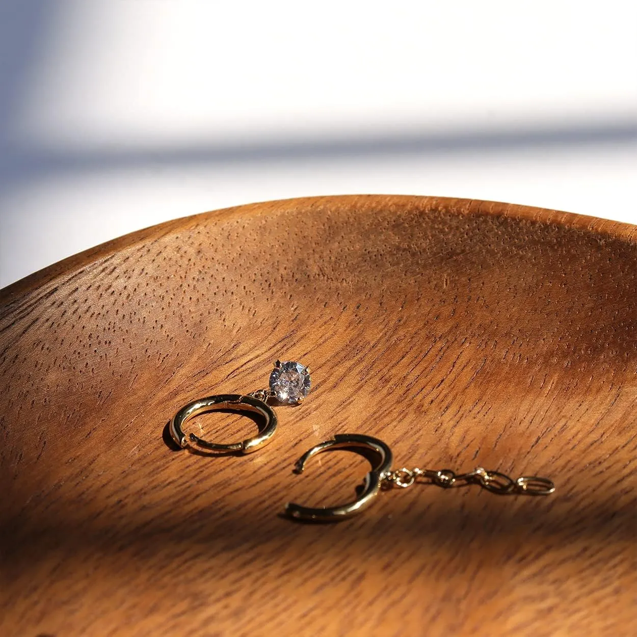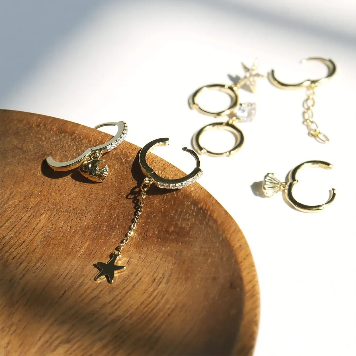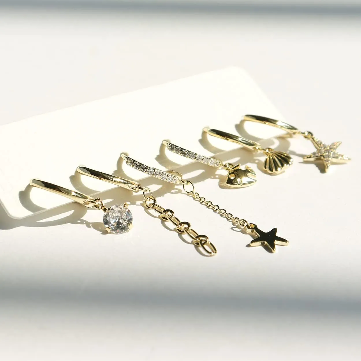 - Lovely fancy tiny cubic zirconia small circle ring huggie earring set, six different drop dangling little charm, one with dangling round rhinestone, one drop pin link chain, one drop angle star, one summer coral fish, one shiny shell, one sparkly pave cubis zirconia starfish.